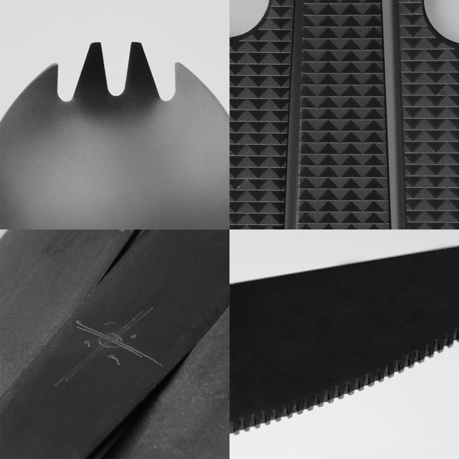 • Laser etched handles featuring Jason's triangular tattoo pattern.